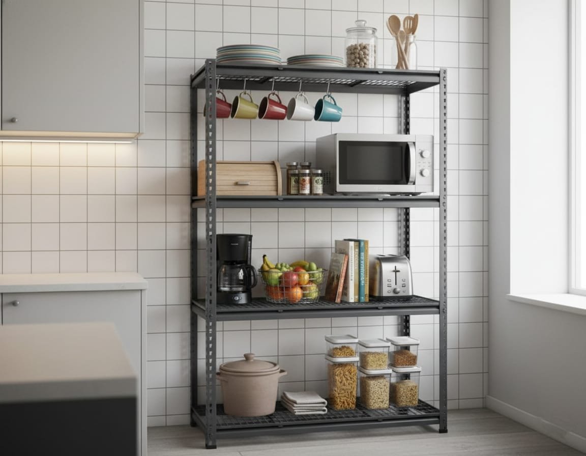أرفف تخزين ومستودعات سعة 4 طبقات 300 كجم باللونين الأبيض والأسود